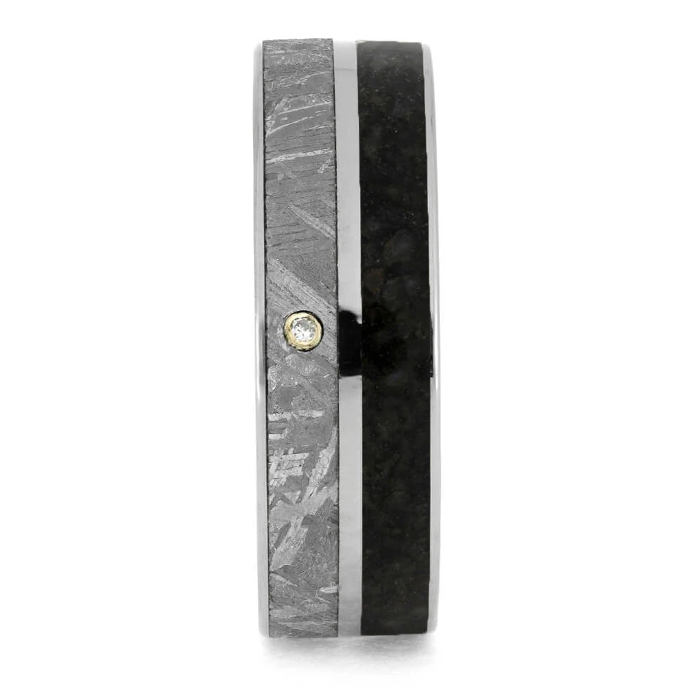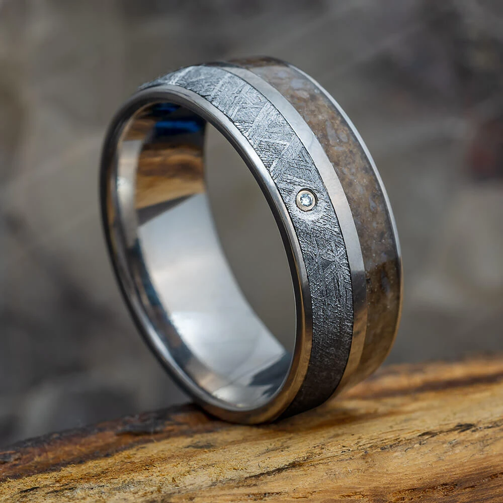 One of my most popular styles is further enhanced with a delicate diamond addition. The stone is set in a solid 14k white gold bezel. This meteorite and dinosaur bone wedding band is a timeless piece and true testament of enduring love.