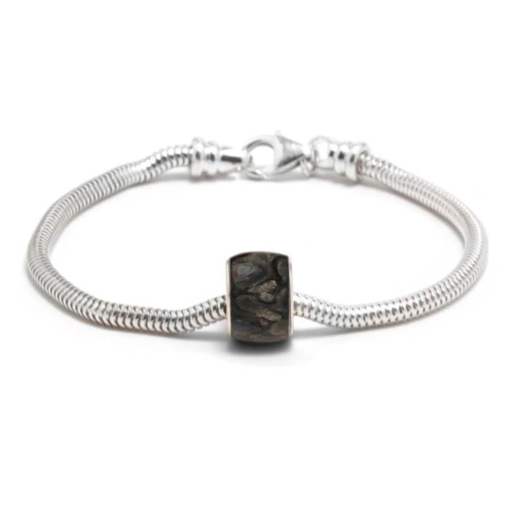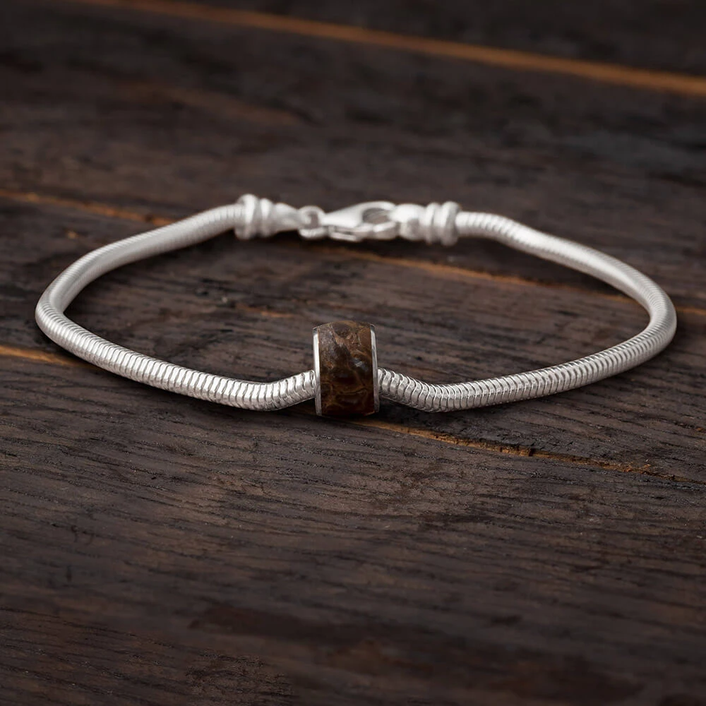 Add a prehistoric look to your every day attire with this dinosaur bone charm bead bracelet. The sterling silver fossil bead hangs on a snake bracelet available in a variety of lengths.