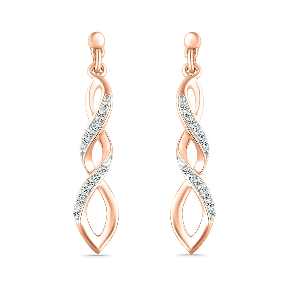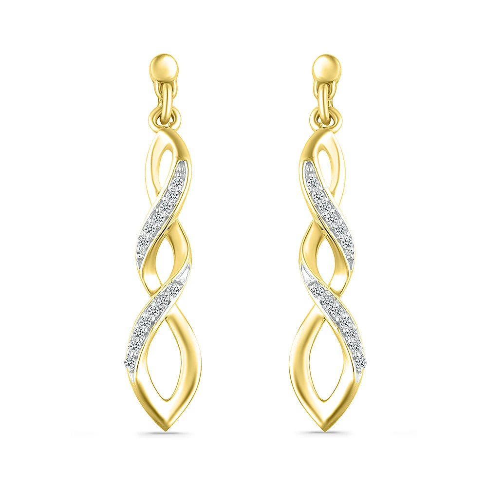 A twirling design of elegance and grace. These unique dangle earrings, available in sterling silver or solid gold, are sure to take her breath away. Diamonds drape down the twisting sides of both earrings for a timeless look.