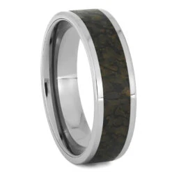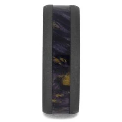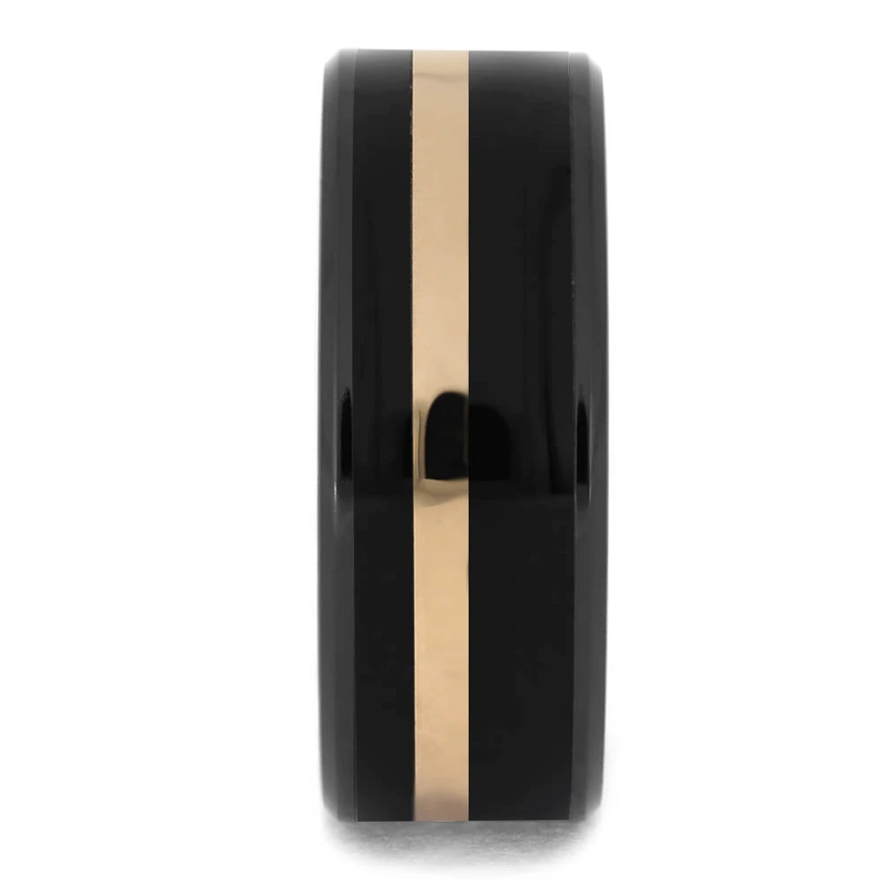 This handcrafted wedding band showcases a intriguing and enigmatic appearance. A glistening 14k rose gold pinstripe wraps around this fascinating ebony wood ring for a splash of color. Black ebony wood pairs beautifully with the polished 14k rose gold pinstripe.