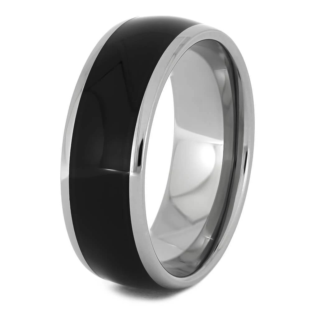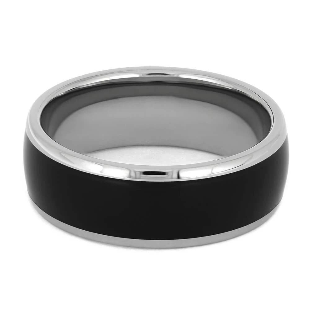 Express your love with style. This sleek titanium band is adorned with a spectacular, black Ebony wood ring. This simple, yet stunning combination makes an outstanding wedding band or special gift. This ring can be worn by men and women.