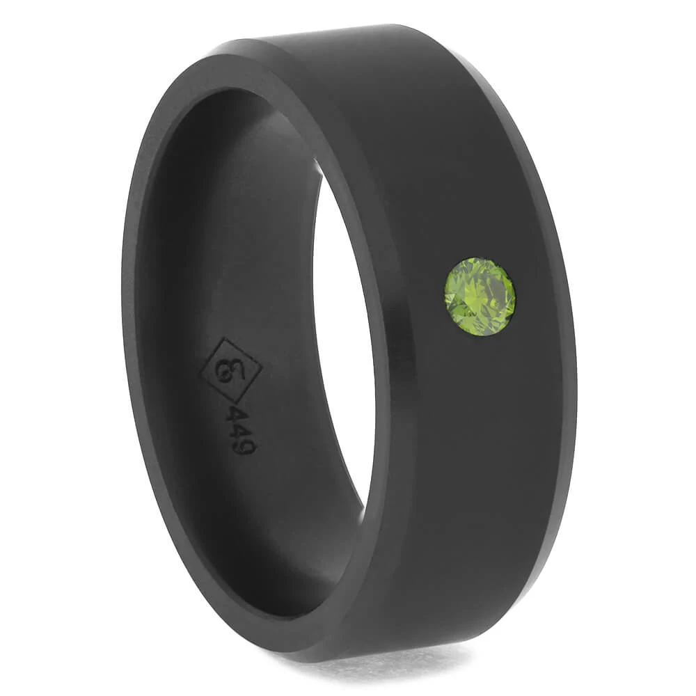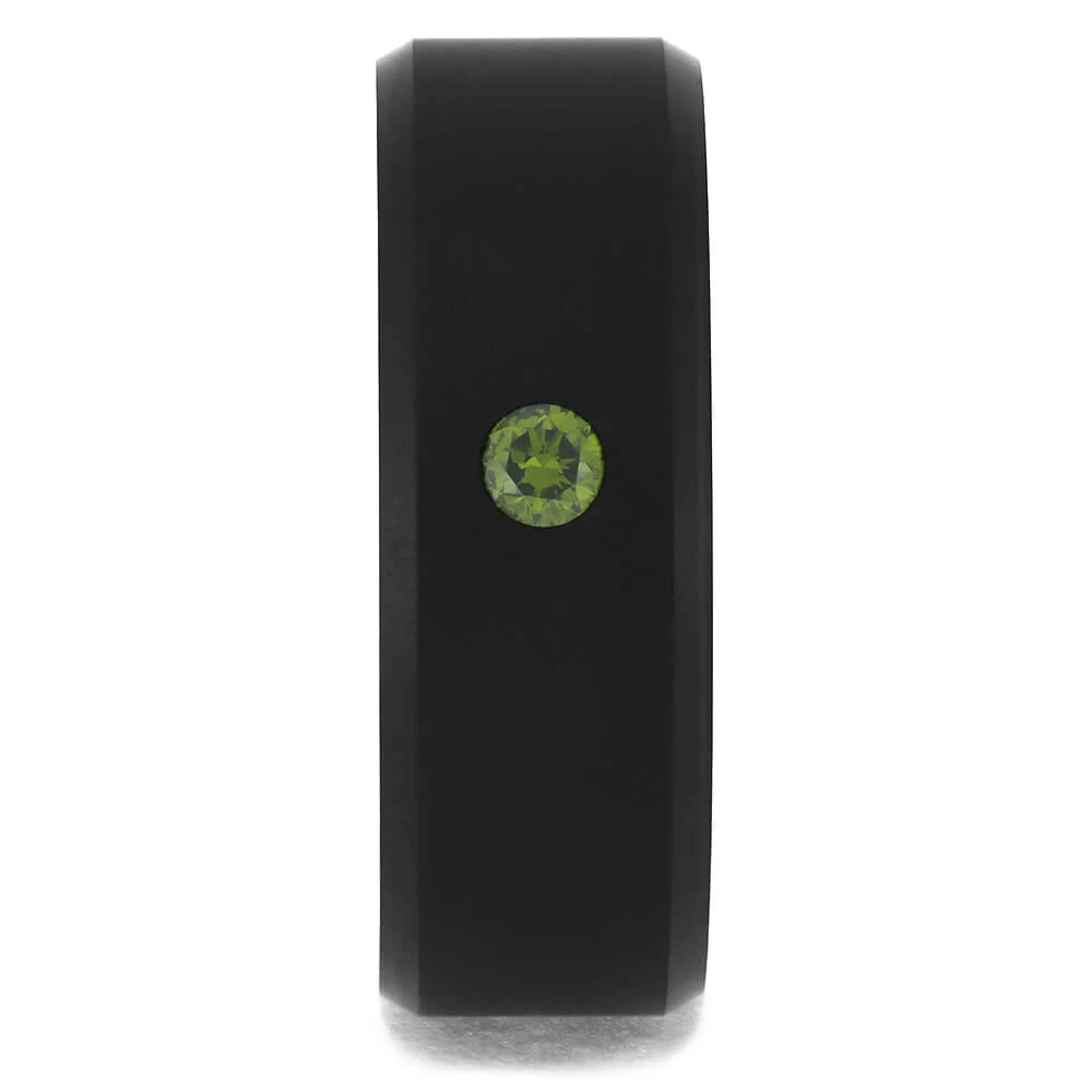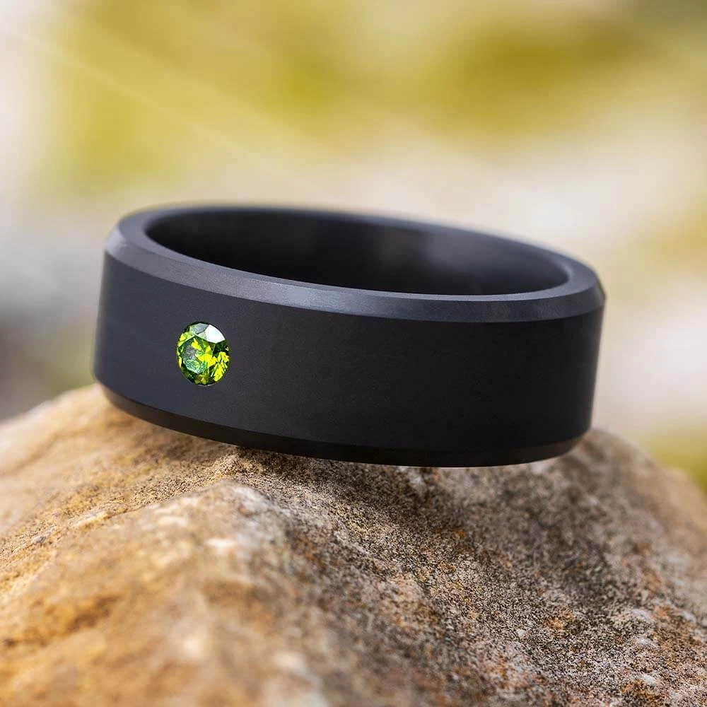 This ring features a solid diamond band with a round-cut green diamond center stone. Elysium Designs has given Jewelry by Johan the honor of selling their Elysium ring line! These black rings are made of pure lab-grown diamond crystals – all compressed together under 1 million PSI and 2700° F. These lightweight premium rings are 16-18 carats total. They never change color, scratch, or fade. In an emergency a ring cracker is capable of breaking the diamond band.