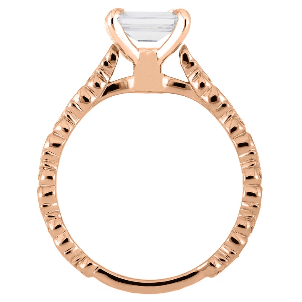 This unique engagement ring features a beautiful, emerald cut moissanite in a 4-prong, claw setting. The unique shank has an embossed, twist profile that has a mesmerizing, vintage look.