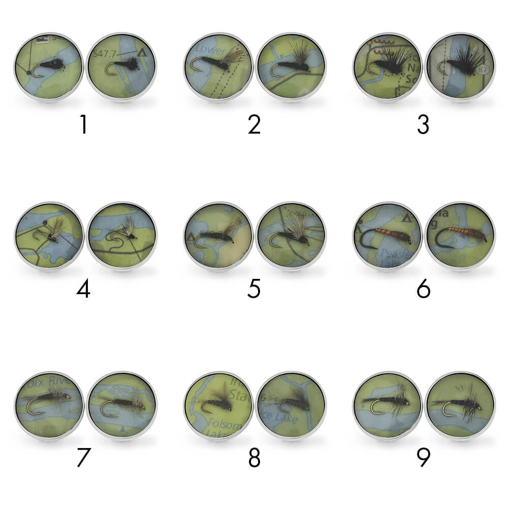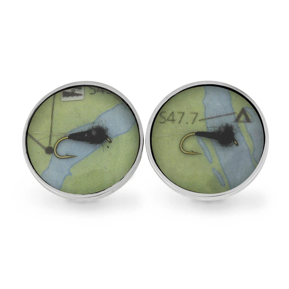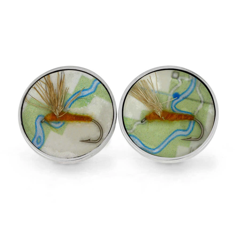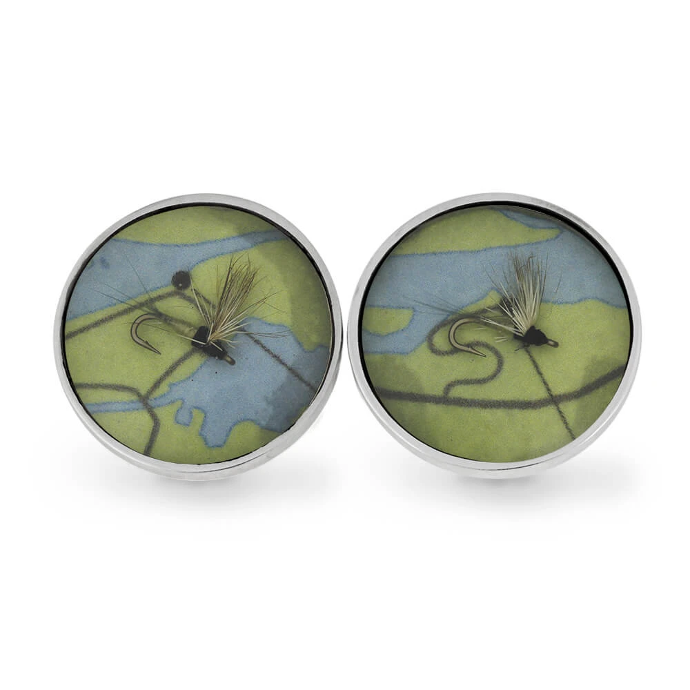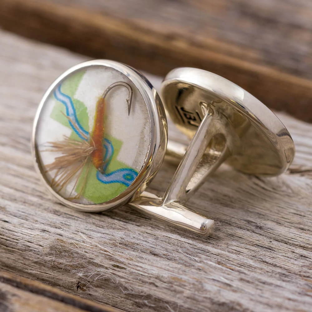 Show off your passion for fishing at even the most formal occasions with these fly fishing cuff links! These sterling silver accessories contain sections of a stream map and a real fly fishing lure in the bezel.