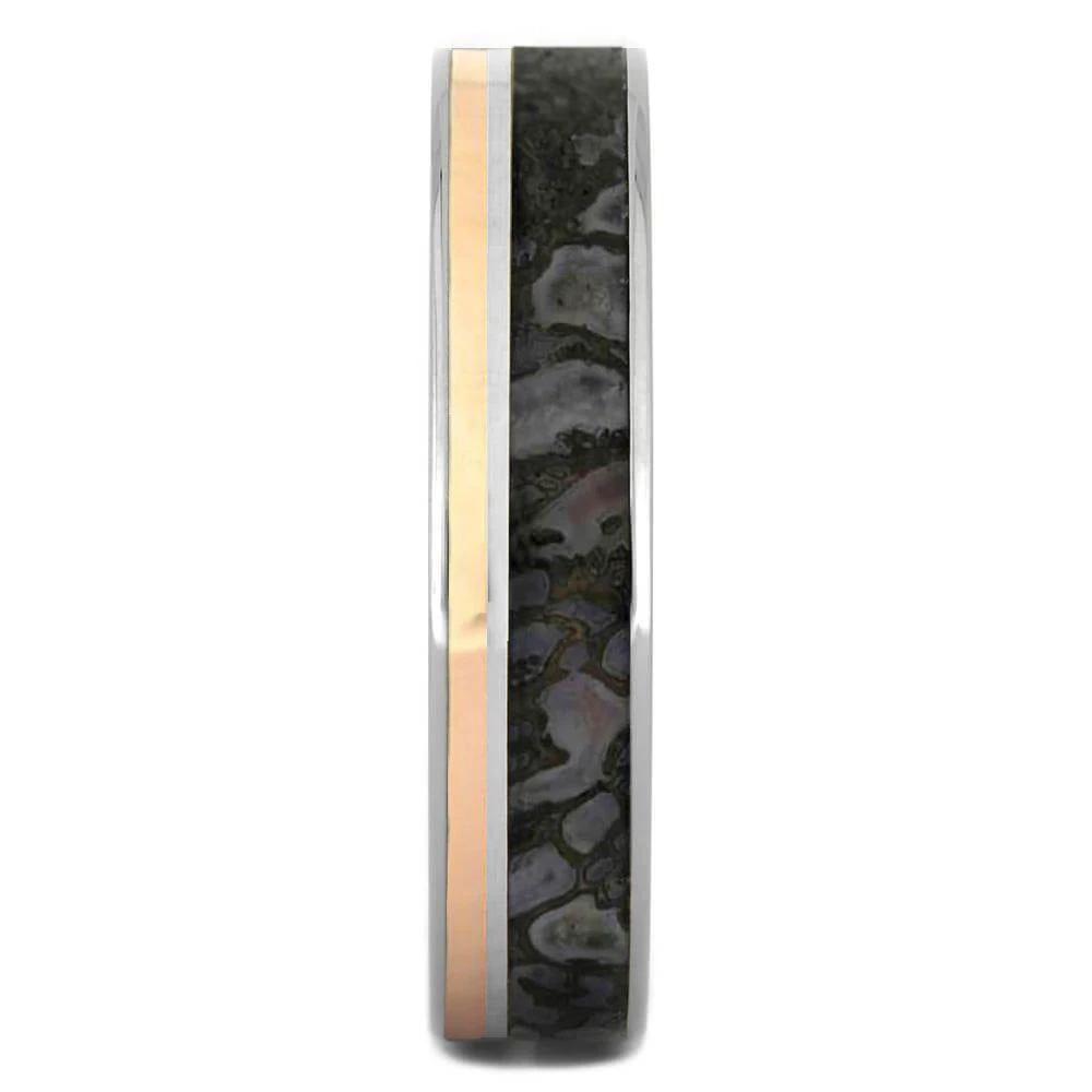 This thin, titanium and fossil ring is sure to stand the test of time! This titanium wedding band features a 14k rose gold pinstripe and an inlay of genuine dinosaur bone. Display your dedication with this symbolic fossil jewelry!