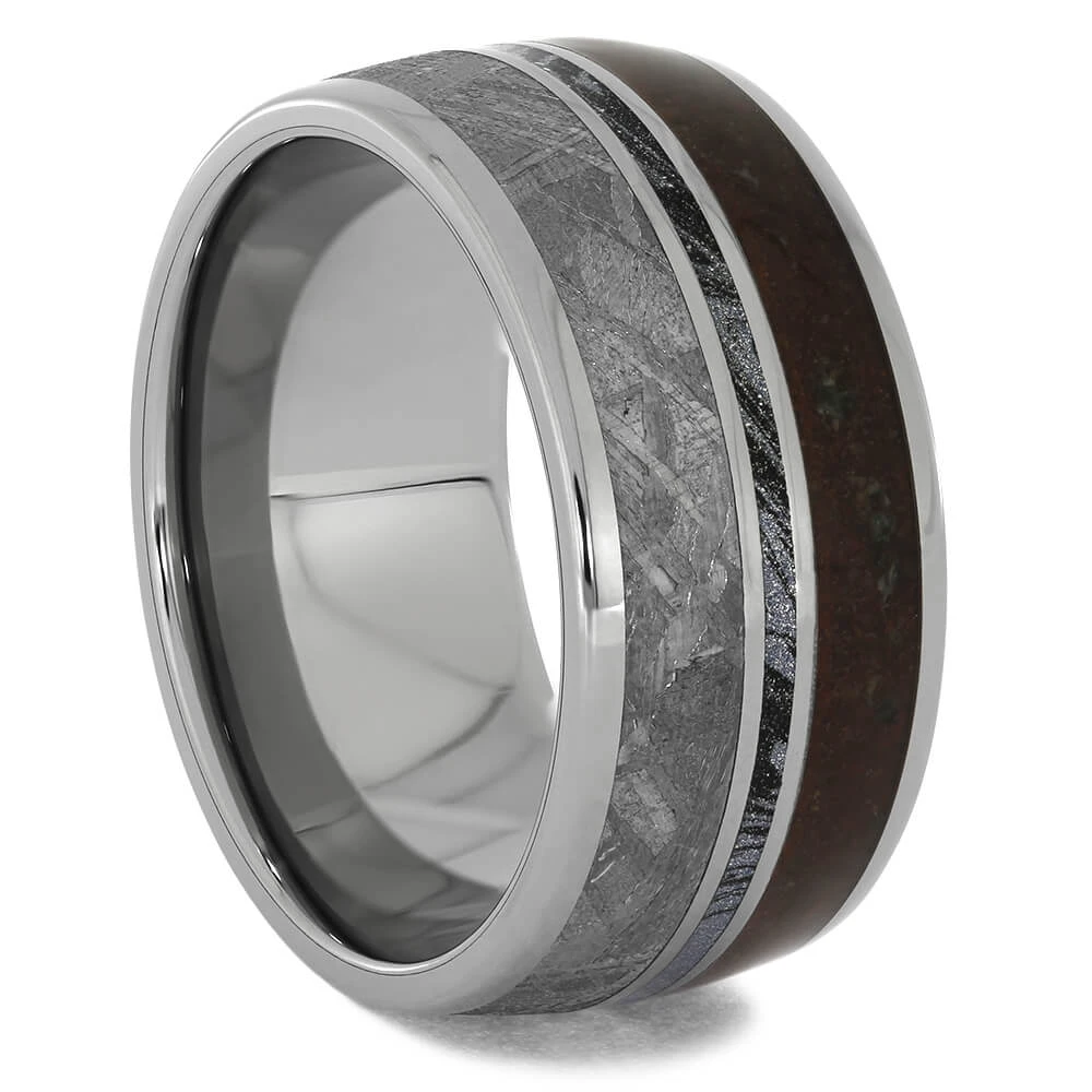 Dinosaur bone and meteorite come together on this fantastic titanium wedding band. A thin pinstripe of cobaltium mokume gane adds a splash of color to this handmade wedding band.