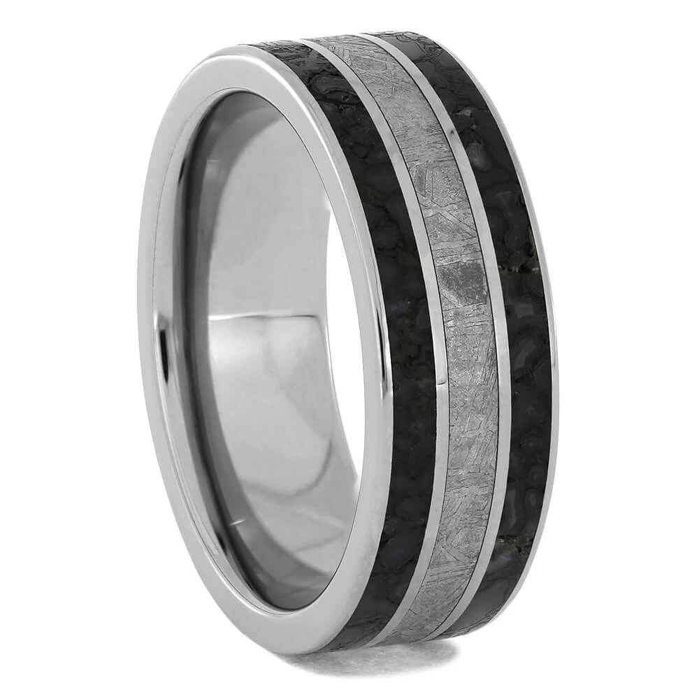 Wear a piece of pre-history with this fossil and meteorite ring! Authentic Gibeon meteorite and fossilized dinosaur bone decorate the inlays of the titanium band for a look that has stood the tests of time.