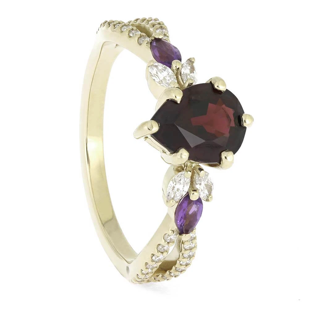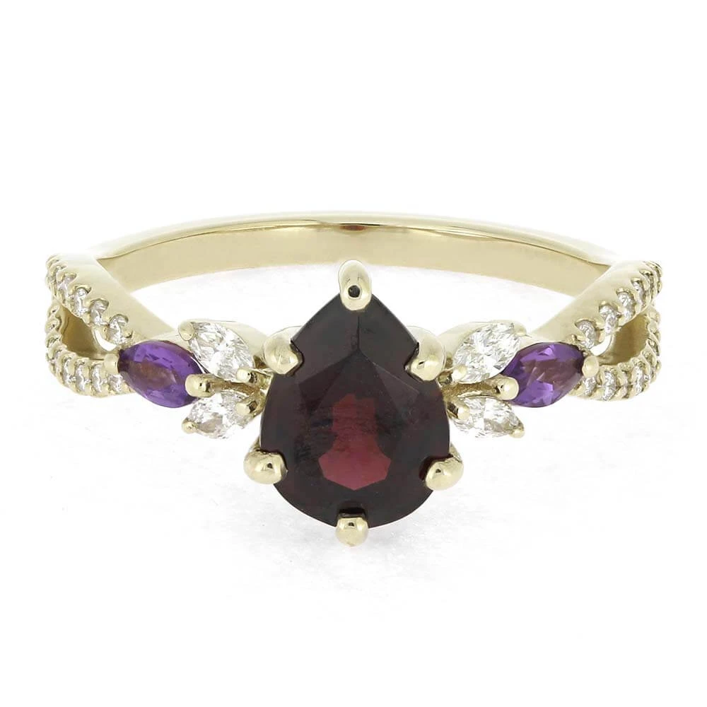 This custom birthstone engagement ring boasts exquisite design, crafted with 14k white gold. Its ornate band features a captivating, twisting pattern and is adorned with dazzling diamonds and amethyst gems, elevating the natural beauty of the colorful birthstones.