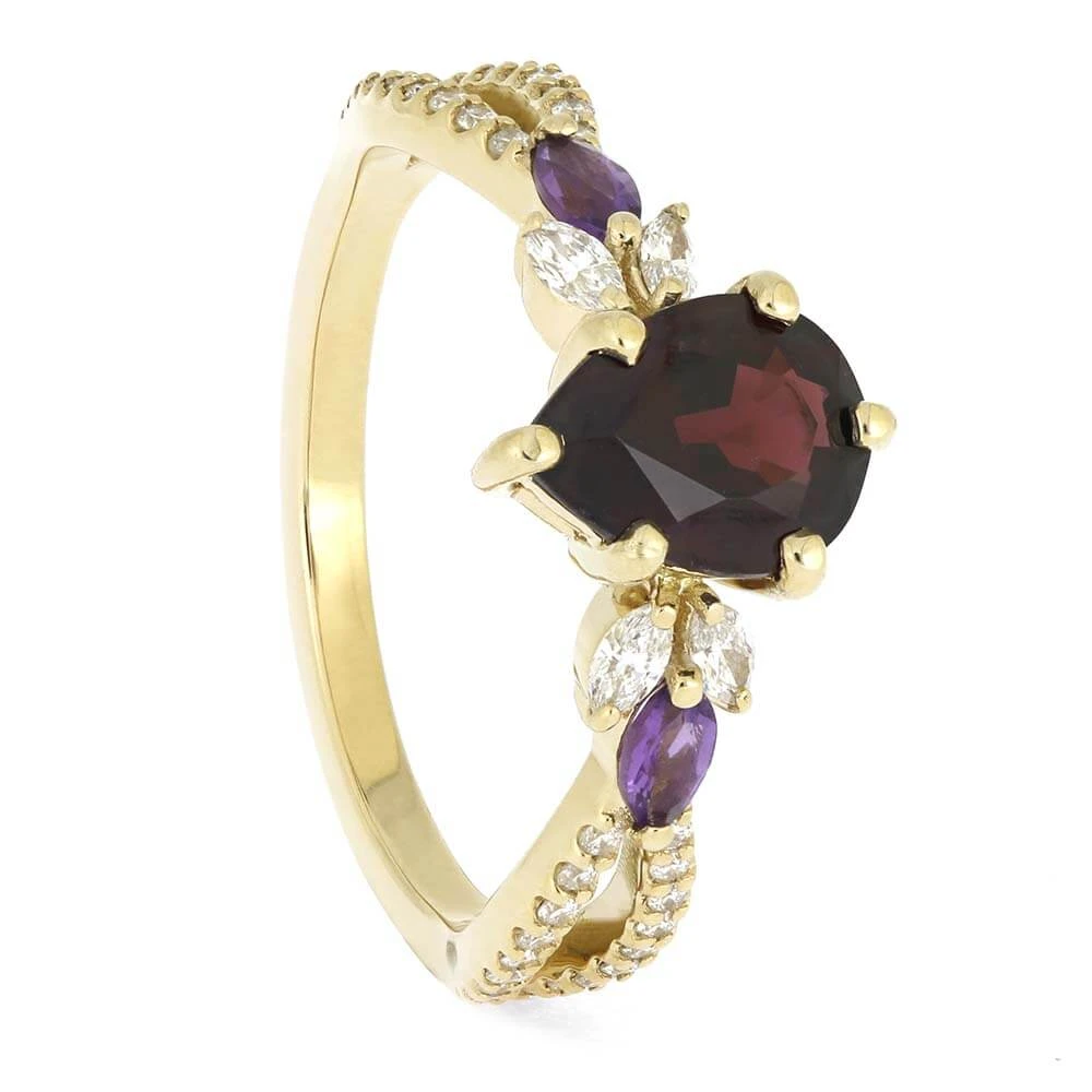 This exquisite garnet engagement ring is meticulously crafted with 14k yellow gold and showcases a striking and one-of-a-kind design. The ornate band showcases a mesmerizing, twisting pattern. It is embellished with side stones of diamond and amethyst, enhancing the organic charm of this exceptional ring.