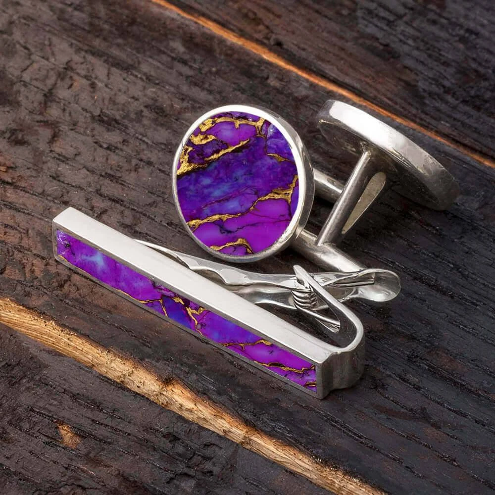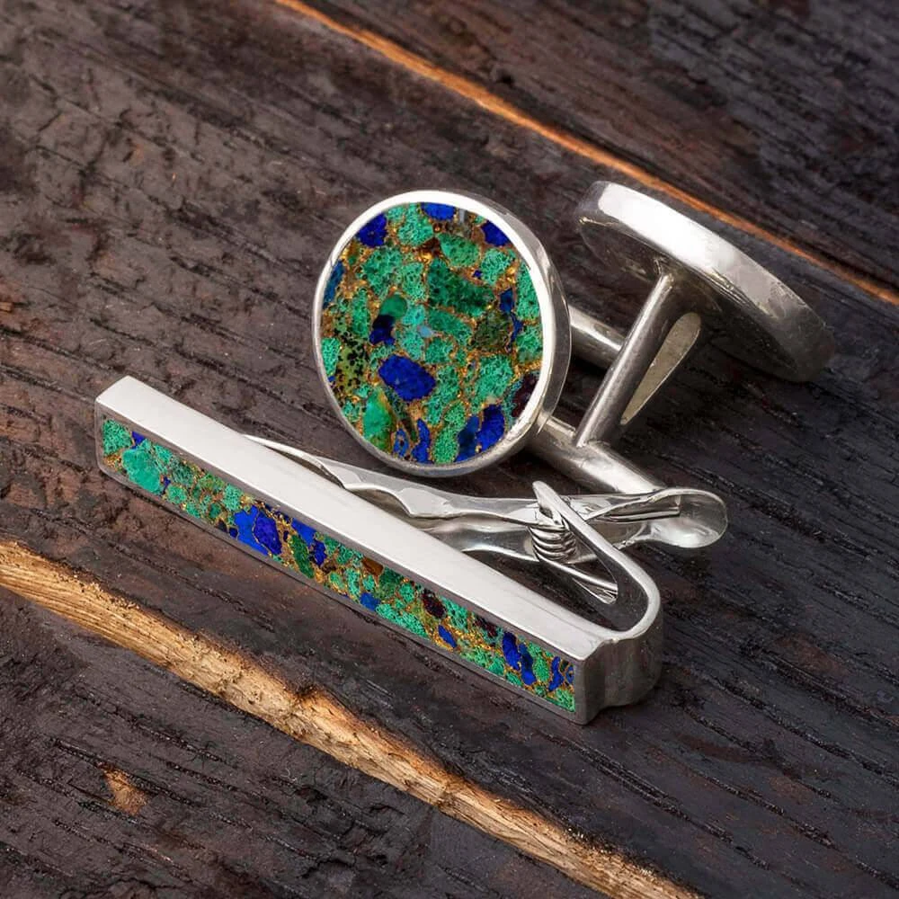 Brighten up your wedding attire with this Gem Alloy cuff link and tie clip gift set! Crafted in polished silver, these gemstone fusions add a colorful twist to any formal attire. Each handmade suit accessory set is available in Lava Mosaic Turquoise, Lava Turquoise, or Desert Mosaic.