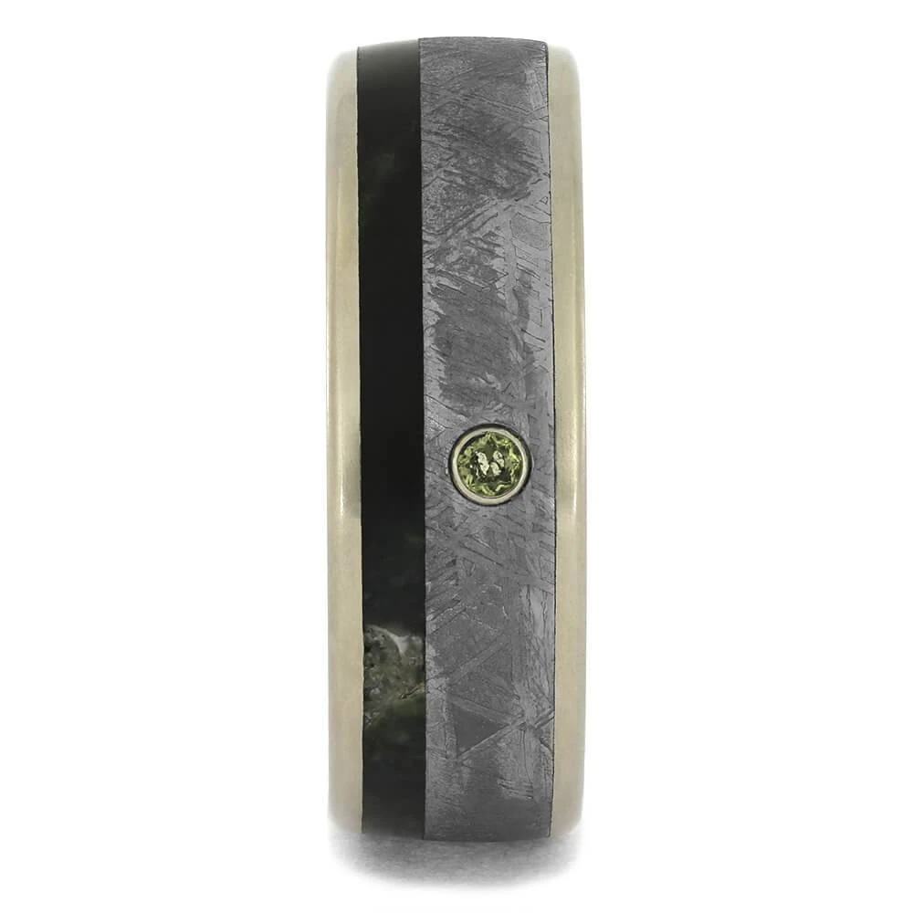 A wonderful, green wedding band with a variety of unique elements, this men’s ring features genuine, green jade and tiny, sparkling peridot bezel set within a genuine meteorite inlay. A far from ordinary ring for your future spouse.