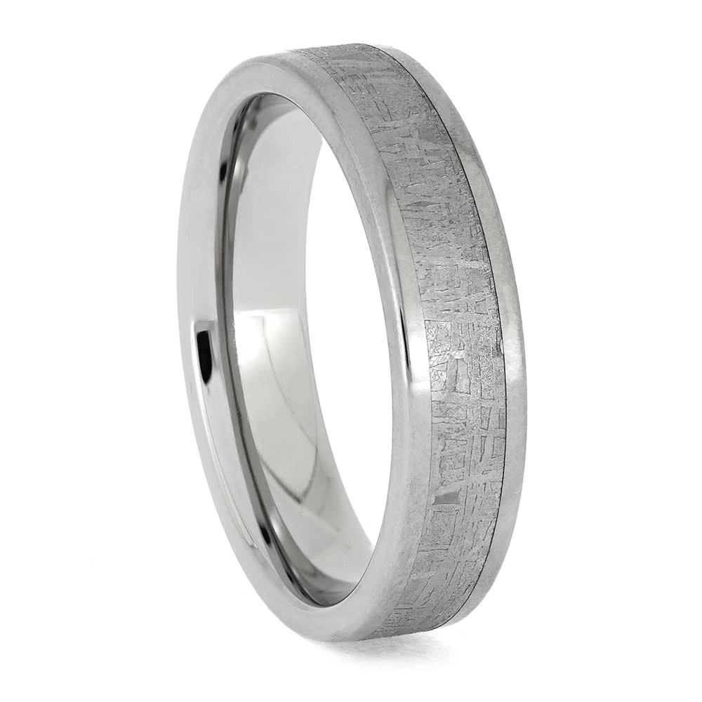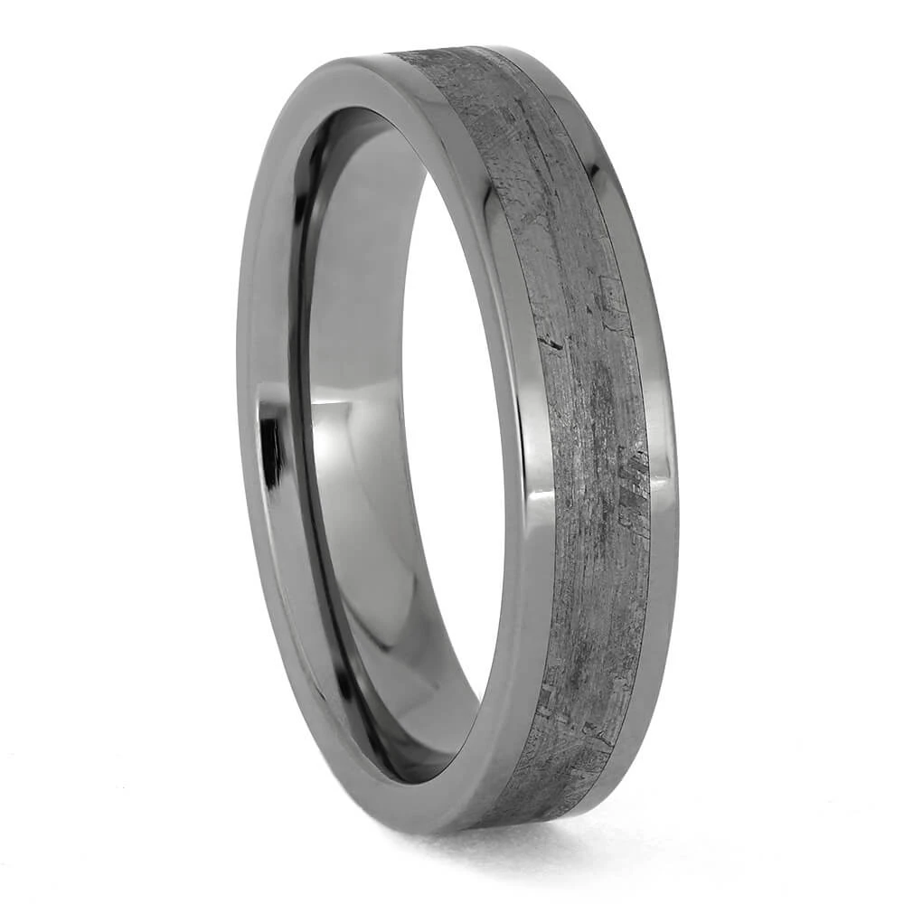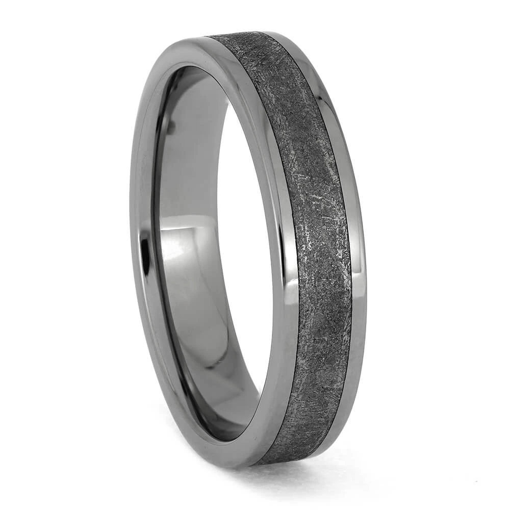 This meteorite wedding band has a flat profile and polished ring finish. The titanium sleeve is created with a comfort fit so you can wear this ring with ease.