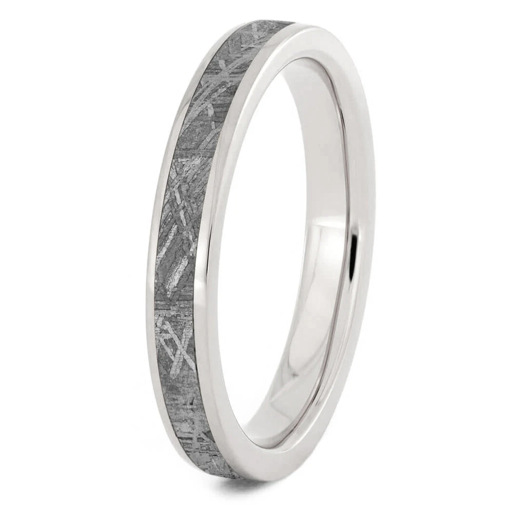 Simple doesn’t always have to mean boring and this women’s meteorite ring is a testament to that! A thin titanium band showcases a gorgeous, genuine meteorite inlay that is full of style and character. The Gibeon meteorite inlay has been etched to reveal the characteristic patterns, or Widmanstätten figures.