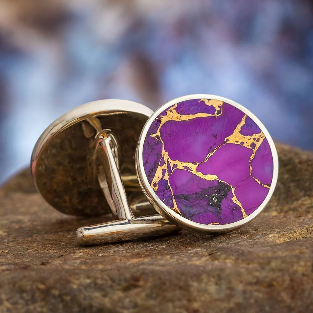 These round cuff links crafted in polished sterling silver can be customized to feature any of our colorful gem alloy materials. Each showcases a unique combination of blue, purple and green colors for a one-of-a-kind suit accessory. They pair perfectly with other items in our gem alloy jewelry collection to create a complete, men’s accessory ensemble.