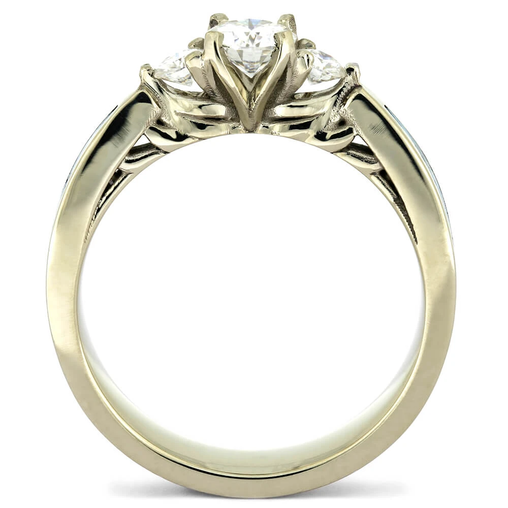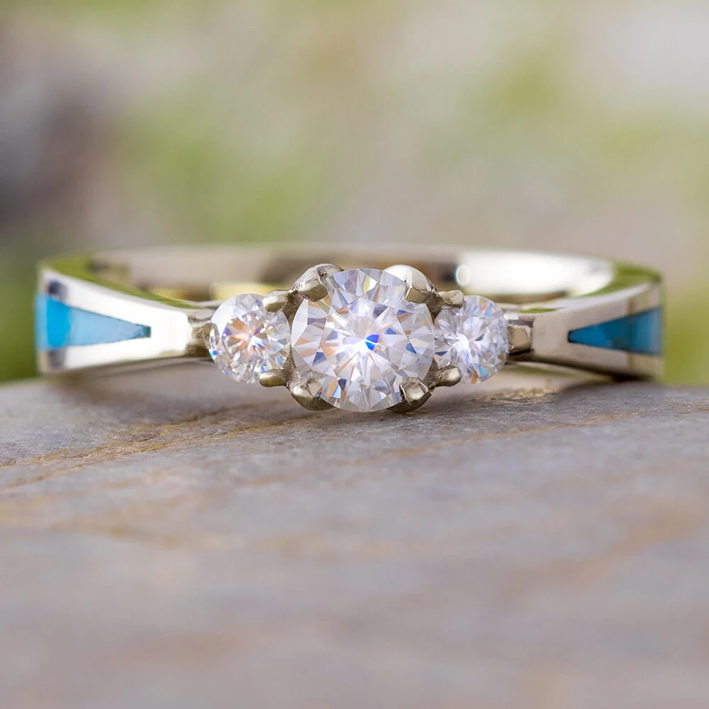 Present her with this turquoise 14k white gold engagement ring to prove to her that she is the one and only. Three moissanites sit on a unique, floral-inspired prong setting. Each stone representing your past, present, and future together; these moissanites are brilliant and have the most sparkle.