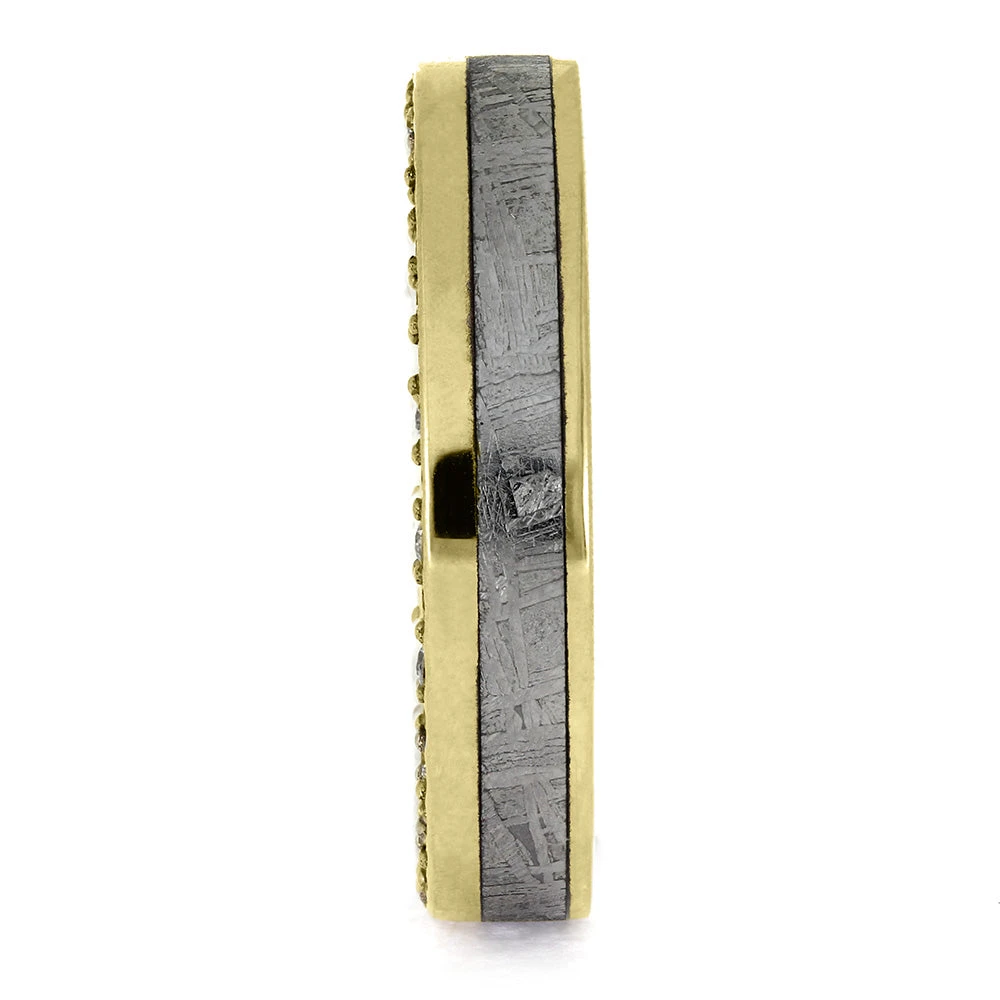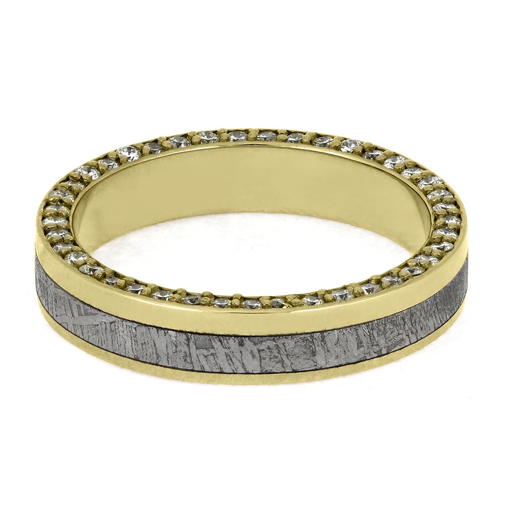 This remarkable wedding band by Jewelry by Johan displays a seamless band of diamonds, symbolizing enduring elegance. Handmade in the USA, it incorporates authentic Gibeon meteorite with its characteristic etched design, offering a uniquely refined and distinguished look.