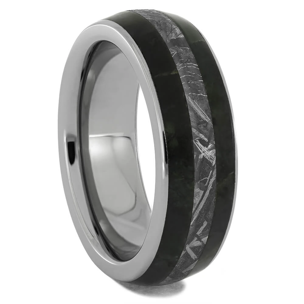 Earth and space come together for a colorful, masculine style on this meteorite and green jade wedding band. This men’s titanium ring is made with two of the most unique materials. The metallic Gibeon meteorite glistens between two inlays of swirling green jade. Show your love of nature with this unique titanium wedding band!