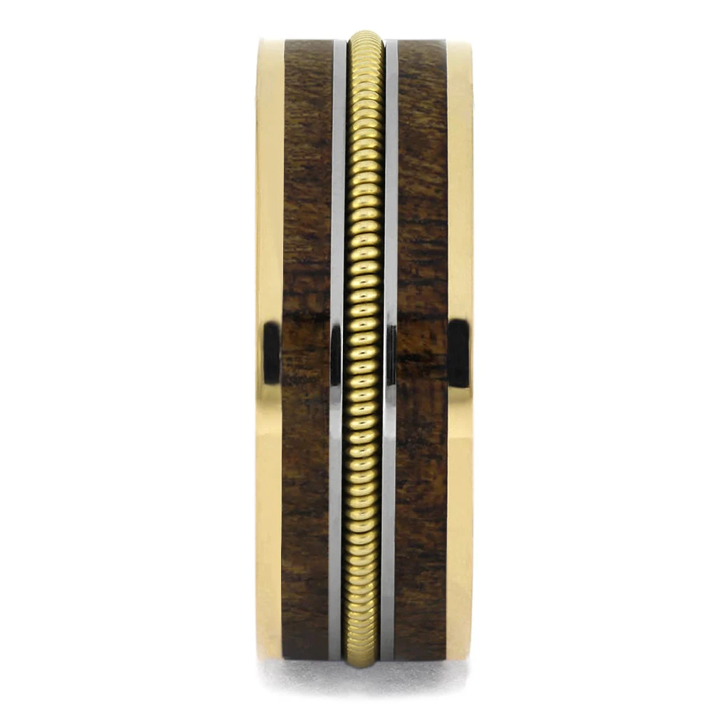 This solid 14k yellow gold wedding band features Koa wood inlays and a golden guitar string surrounded by polished titanium. Unique and handmade, this symmetrical design highlights the inlaid string. Great for that special musician in your life!