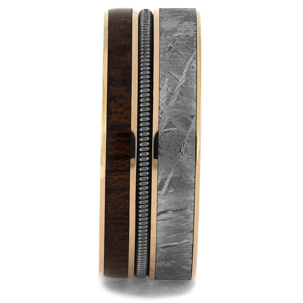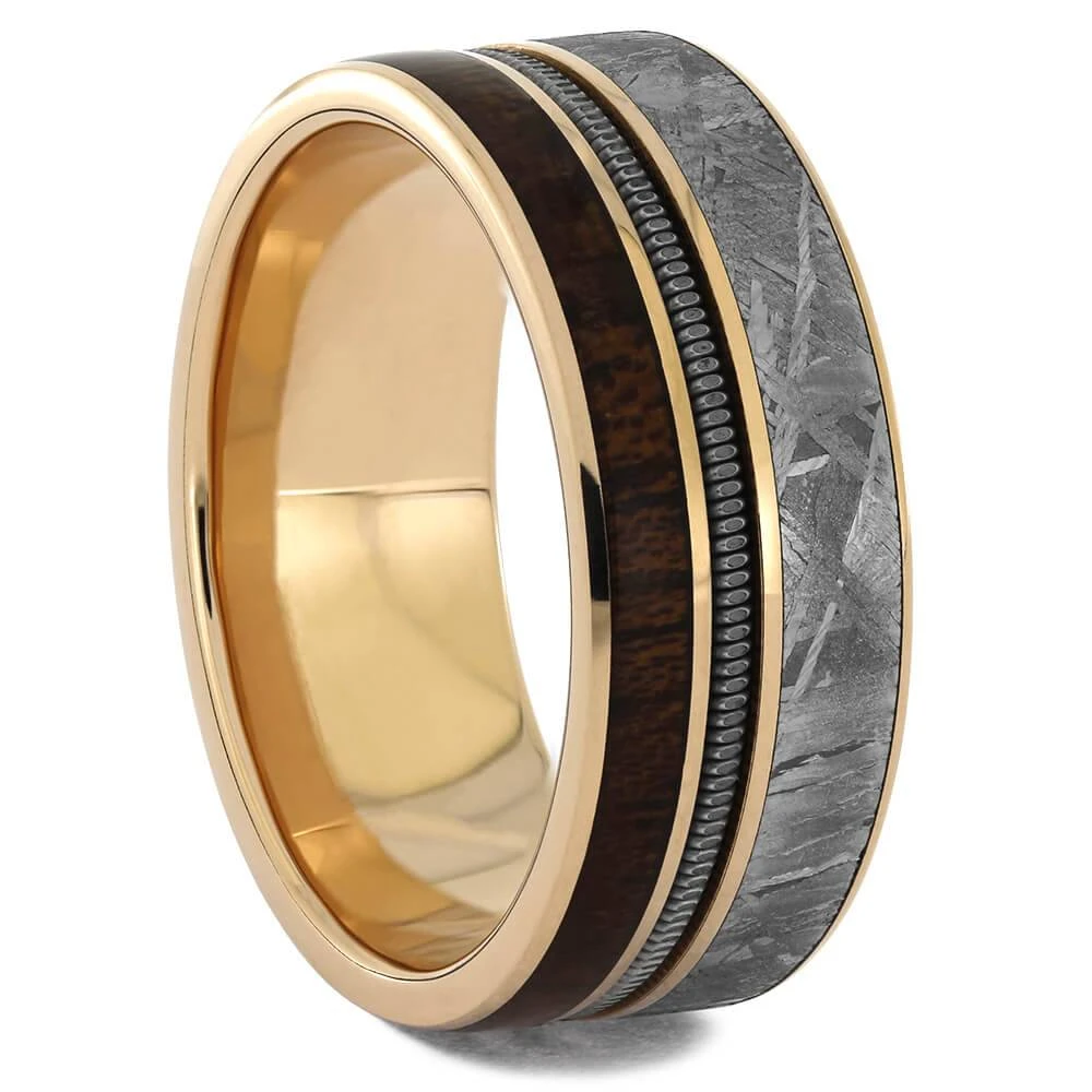 This exquisite ring features a polished finish that accentuates its unique composition. The sleeve is crafted from elegant rose gold, providing a warm and sophisticated base. At the heart of its design lies a band of rich mahogany, flanked by slender layers of rose gold, adding a refined touch. A distinctive white guitar string inlay introduces an unconventional element, symbolizing harmony and creativity. The centerpiece is a band of authentic Gibeon meteorite, known for its captivating patterns and cosmic origin, making this ring a true testament to the beauty of the universe. This piece is a perfect blend of natural elegance and artistic innovation, designed for those who appreciate the extraordinary.
