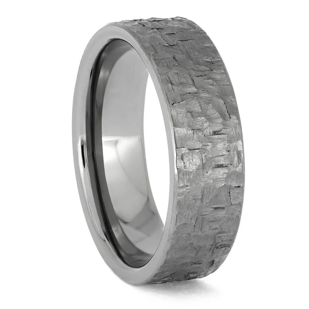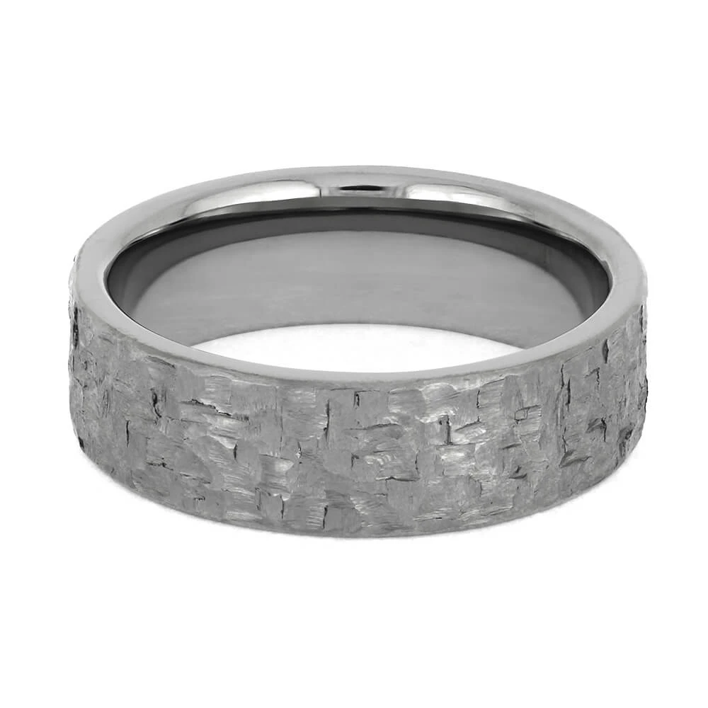 Allow us to make your wedding band dreams a reality. This custom profile titanium wedding band is designed with a hammered style and polished finish.