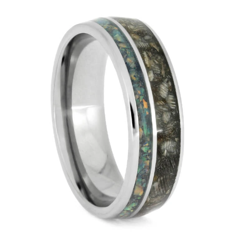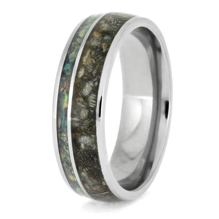 Celebrate your horse and keep their memory close at hand with a horse hoof ring. This pet memorial jewelry is made with polished titanium, and is accented with an inlay of colorful synthetic opal. You can send us a sample of hoof shavings, or we can provide our own hoof material, the hoof used in house is sourced from a local horse rescue.