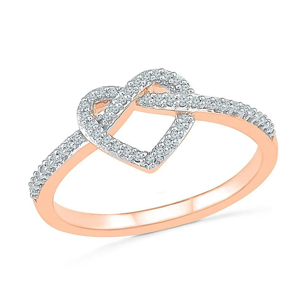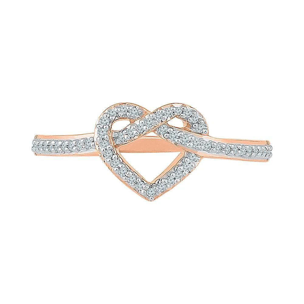 With a diamond encrusted knotted heart design, this unique ring is sure to make her eyes sparkle when she sees it! This heart ring is great as an anniversary or birthday gift! Available in your choice or rose, yellow or white gold. Sterling silver is also an option.