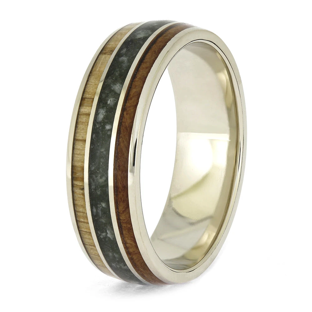 Expertly crafted with polished 14k white gold, this colorful wedding band features stunning oak and madrone wood accents and a vibrant green jade centerpiece. The opulent gold borders and pinstripes add a lavish touch to this nature-inspired creation, making it a truly exquisite piece.