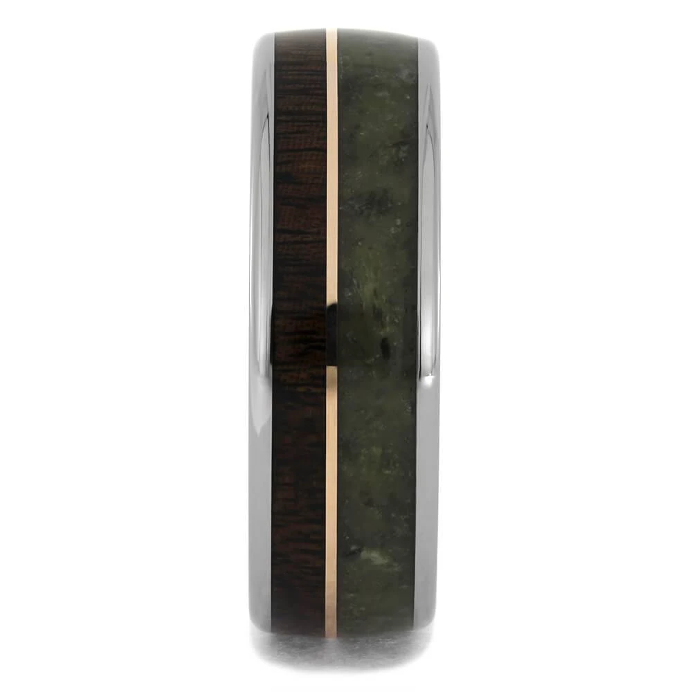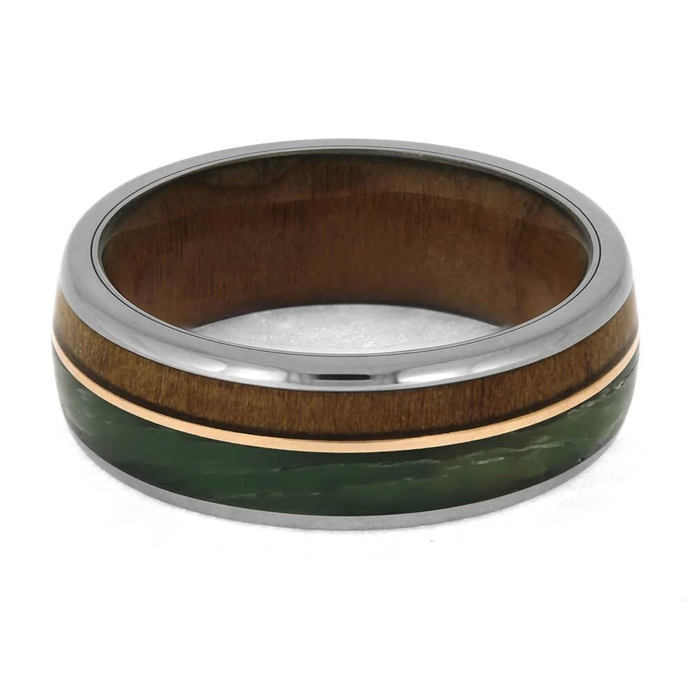 This luxurious combination of jade and gold is sure to make a statement! Its unique design features crushed jade, sequoia redwood, and 14k gold accents, creating an eye-catching piece perfect for weddings or anniversaries.
