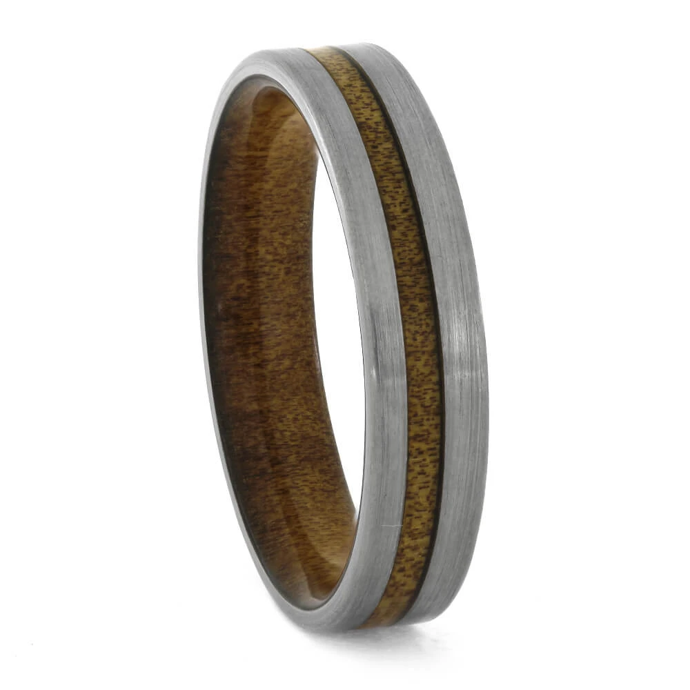 A wonderful Kauri wood wedding band made for anyone who enjoys Mother Nature and outdoor activities. This titanium ring has a comfort fit Kauri wood sleeve and matching wood pinstripe.