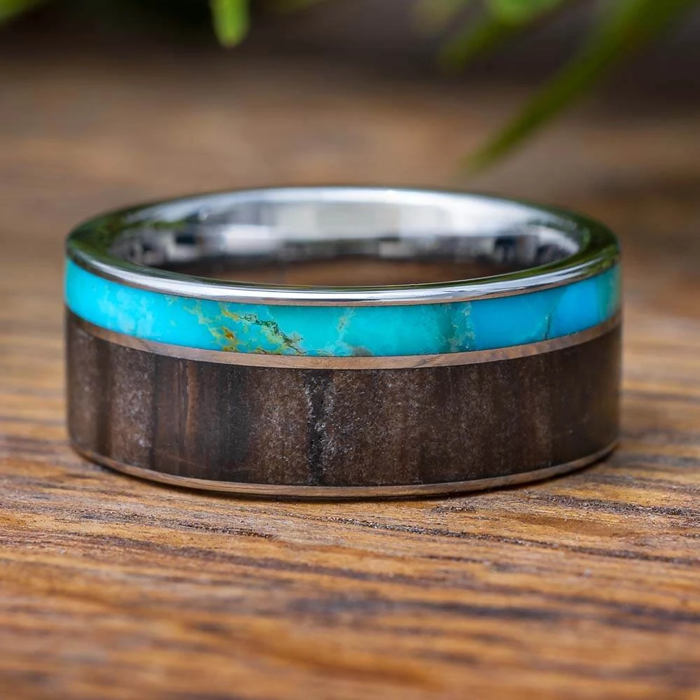Genuine Kingman turquoise, a beautiful mineral prized for generations for its gorgeous blue color, is paired with petrified wood in this nontraditional men’s wedding band. Crafted in lightweight and extremely durable titanium with an off-set pinstriped design.