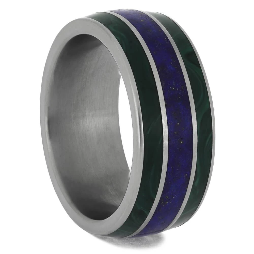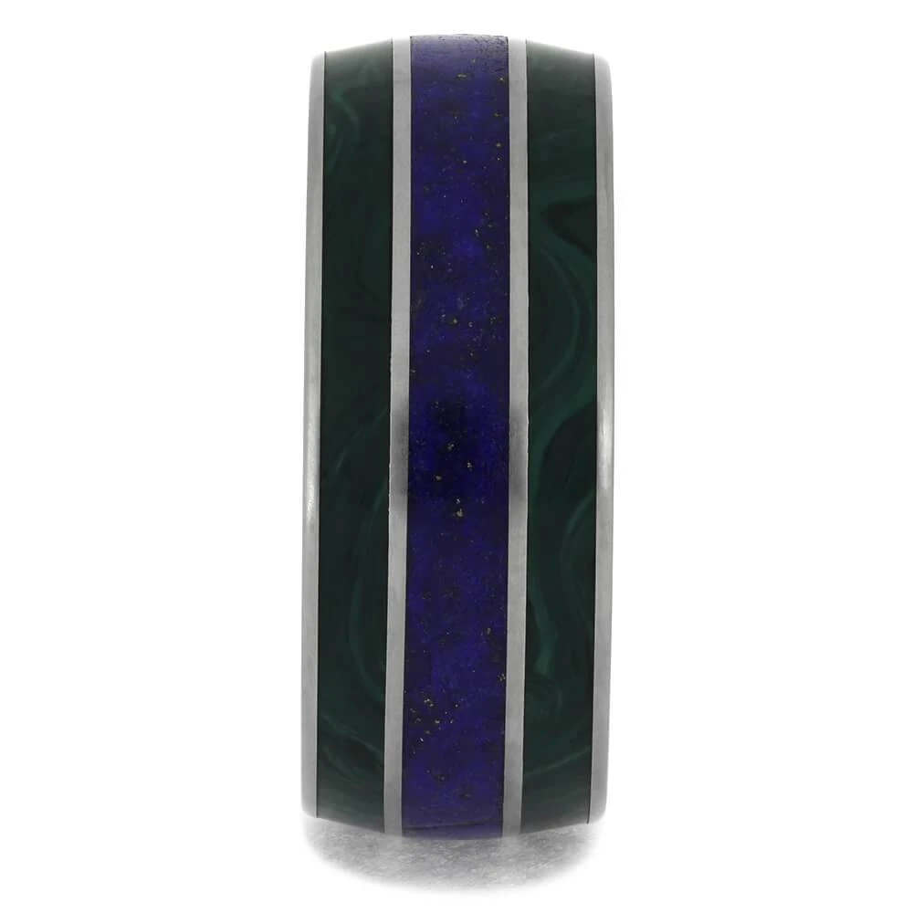 This amazing and unique men’s wedding band features three symmetrical inlays. Featured in the center, an inlay of beautiful, genuine blue lapis lazuli. The two outer inlays both showcase malachite. This blue and green ring is bold, colorful and far from boring.