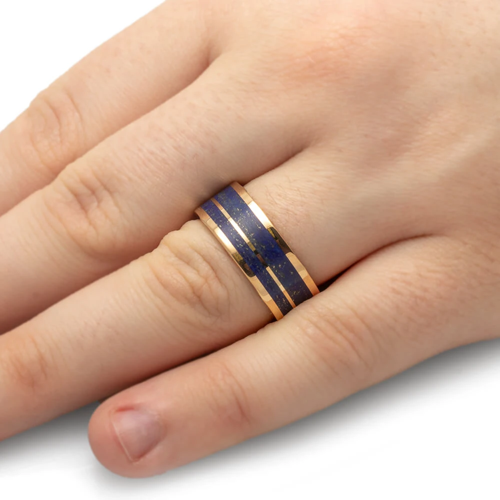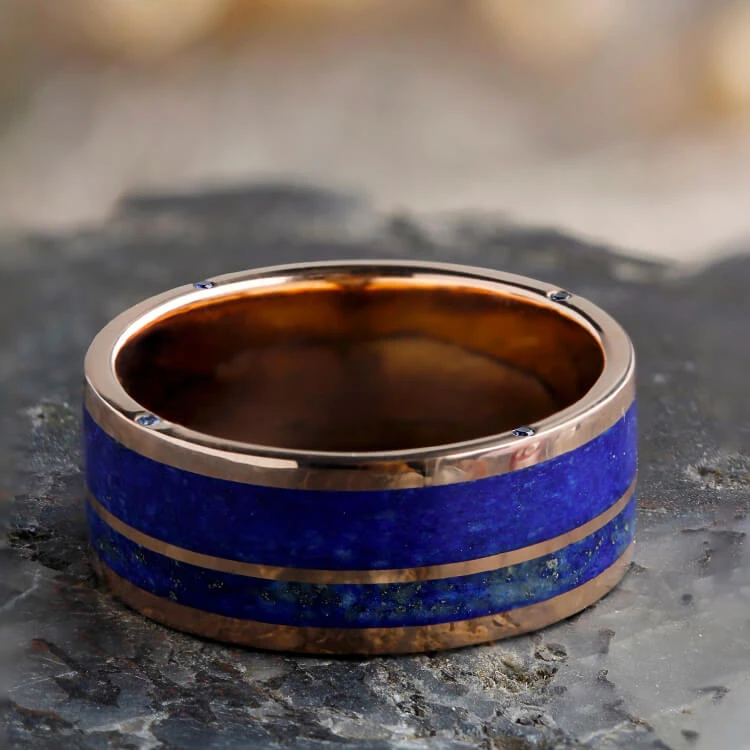 This 14k rose gold blue lapis lazuli wedding band glistens with color from every angle! This gemstone ring has four blue sapphires on each side of the band. Whether you wear this piece of jewelry as a wedding ring or engagement ring, it will surely make a statement.