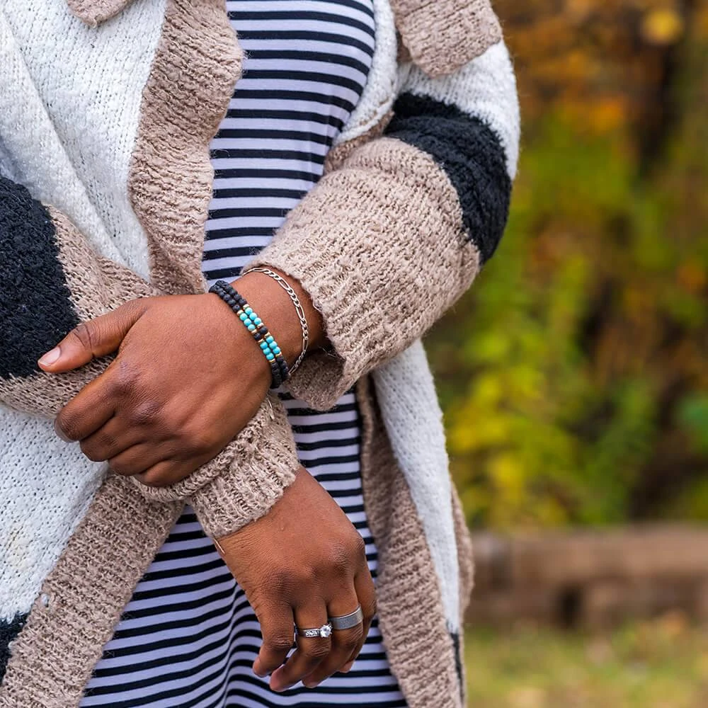 This lava bracelet with turquoise and gold is classic and timeless. The combination of tiny lava stone beads, turquoise beads, and yellow gold spacers make it perfect for both men and women. Perfect alone or stacked in groups, these small bracelets add the perfect touch of rugged sophistication to any outfit.