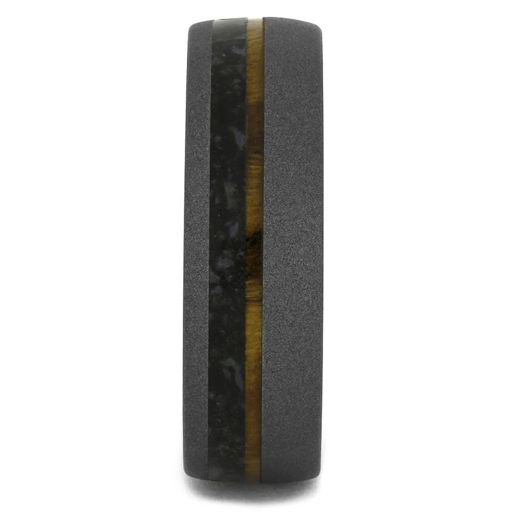 This dinosaur bone wedding band pairs the exotic fossil inlay with an equally gorgeous inlay of lignum vitae wood. The titanium edges are sandblasted, muting the reflectiveness of the metal and bringing focus to the two extraordinary materials.