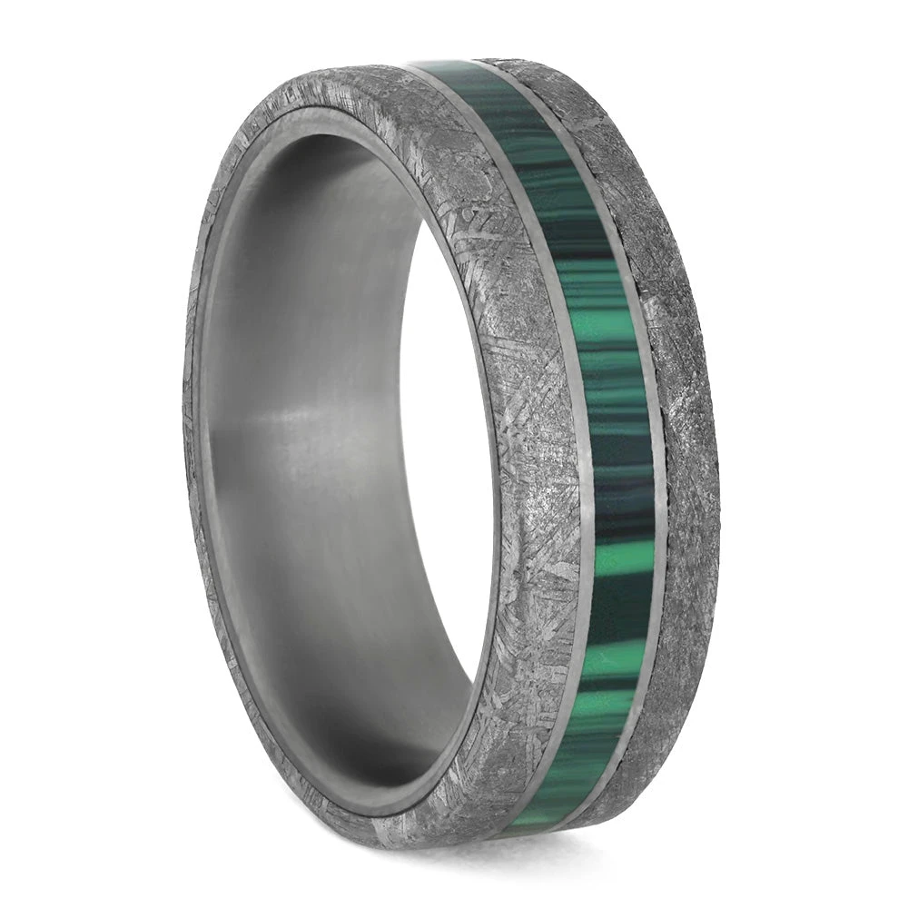 Composite malachite, a gemstone with a beautiful green pattern, is believed to amplify energies of all kinds, both positive and negative. An appropriate wedding band for the realist who understands marriage is a bit of both…and that’s ok!