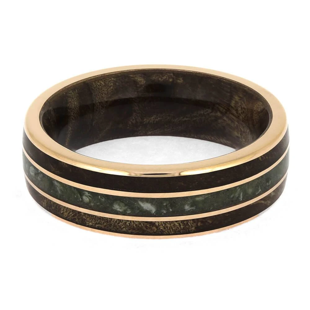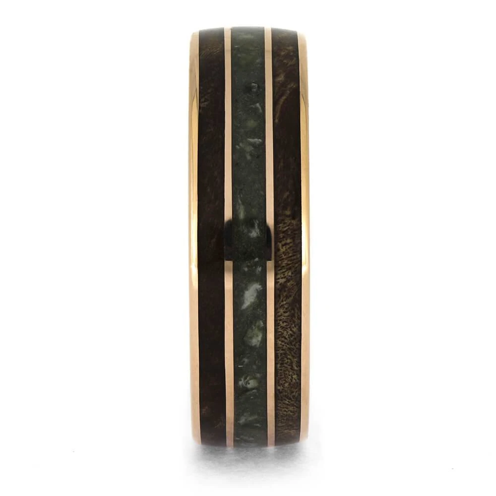 This exquisite ring is crafted by hand from solid gold, featuring a maple burl sleeve and a striking green jade inlay. The golden edges add a final touch of luxury to this nature-inspired piece.