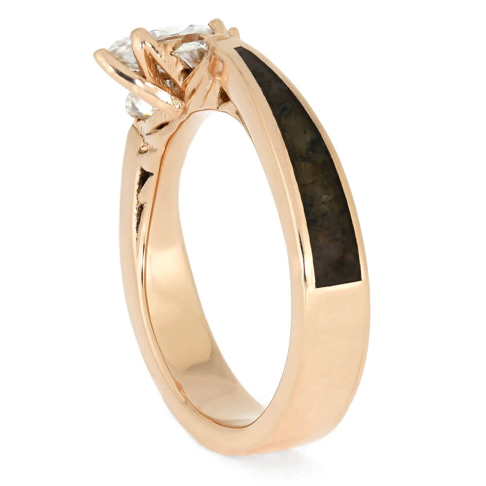 A traditional design like the three stone engagement ring has never looked so unique! Crushed dinosaur bone is framed by 14k rose gold making this a ring worthy of symbolizing your love that will never go extinct.