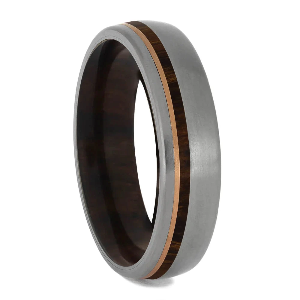 Celebrate your love and commitment with this his and hers wood wedding band set. Both titanium rings are inlaid with the same wood and have a thin 14k rose gold pinstripe.