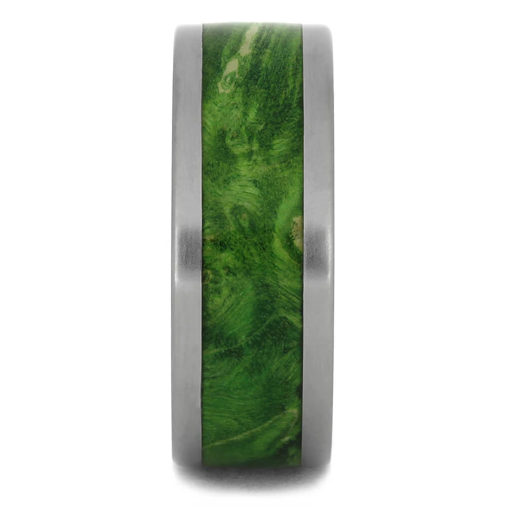This titanium wedding band features a brilliant, green wood ring inlay made with box elder burl. The box elder burl was gleaned from a timber production area which would otherwise have sold the wood as firewood, making it very Eco Earth Friendly and perfect for making rings..