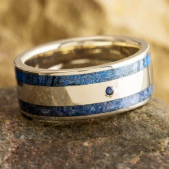 This elegant wedding band from Jewelry by Johan features a striking combination of blue mokume gane and sapphire. Crafted in 14k white gold, it’s an ideal option for those born in September or drawn to the bold blue and gold color scheme.