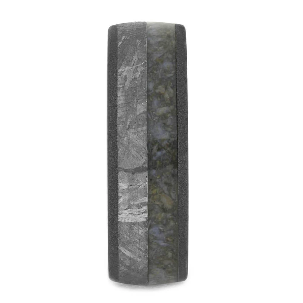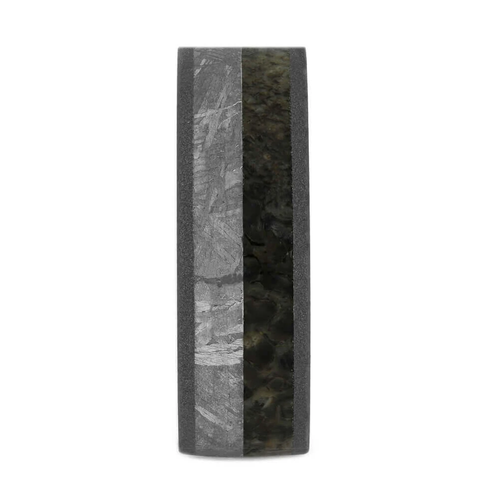 This titanium wedding band pairs unique materials with a comfortable ironwood sleeve. The Gibeon meteorite on the surface sits beside genuine dinosaur bone, while underneath the titanium band is a comfort fit sleeve of wood. The sandblasted titanium gives the ring a dark tone that compliments the natural patterns of the dinosaur bone and meteorite.