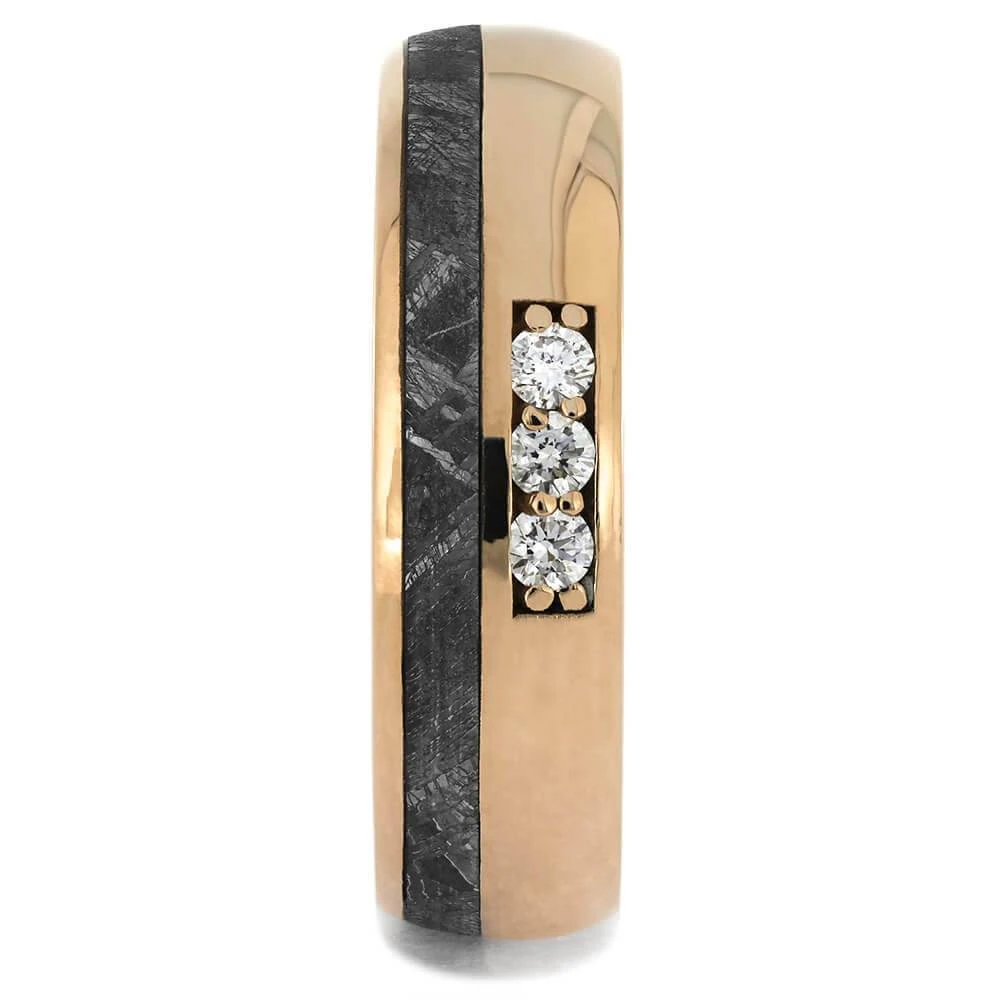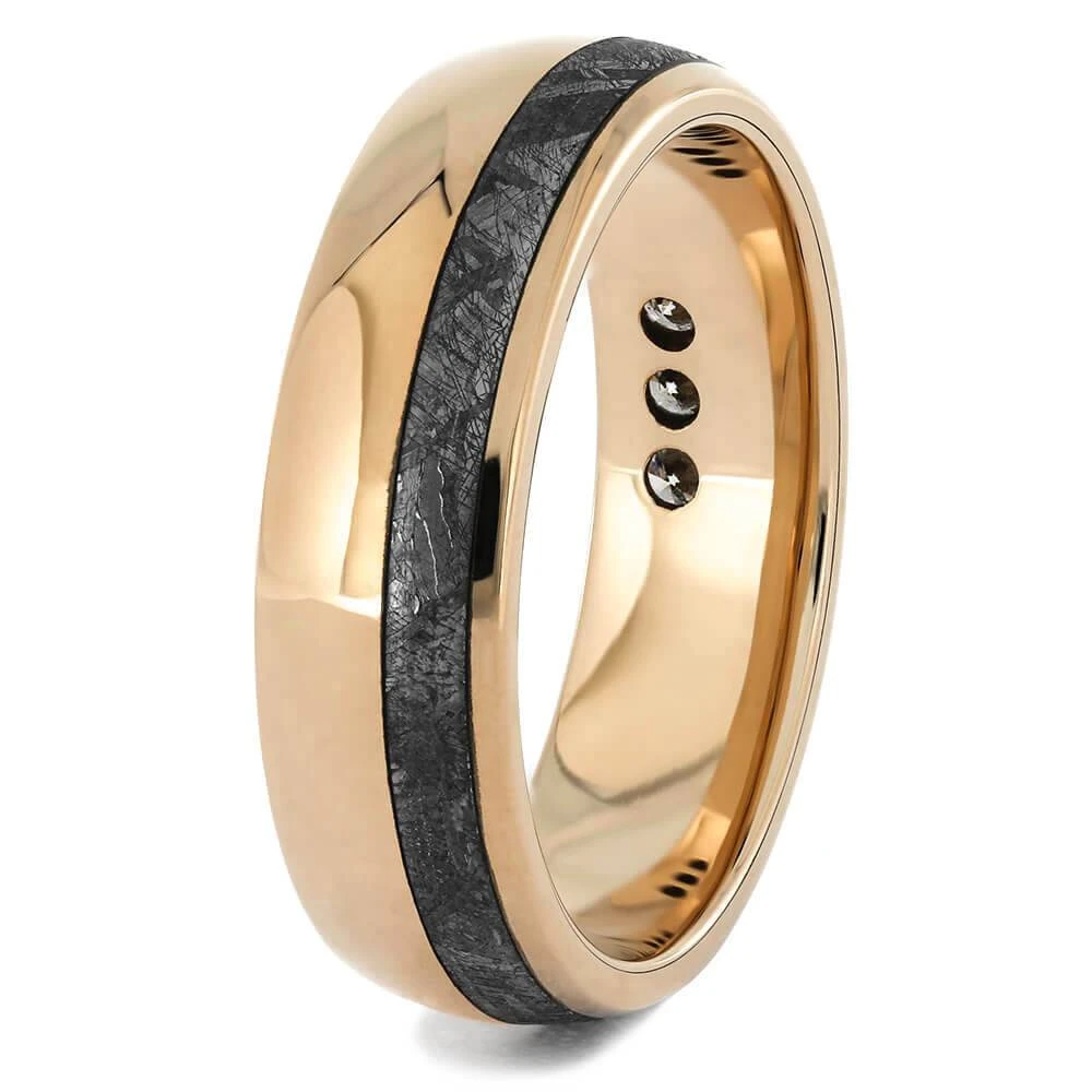 Strengthen the aesthetic appeal of your 14k rose gold wedding band with a genuine meteorite inlay. Three round-cut diamonds, which represent your relationship’s progress, are a perfect addition to this ring. Customizable gemstone options are also available; just contact our design team!