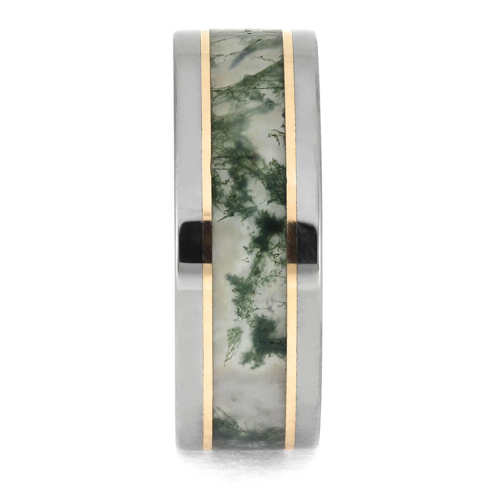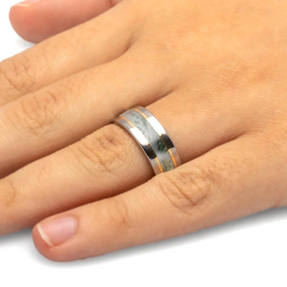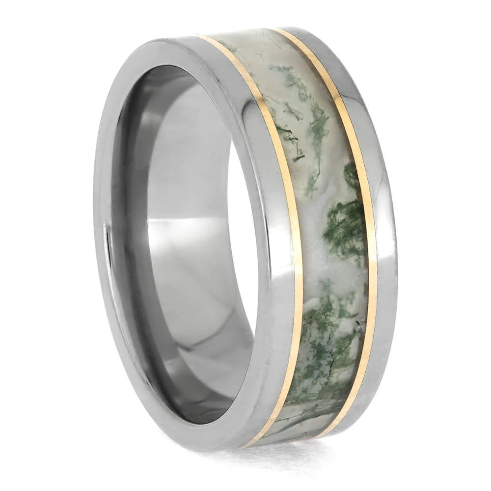 This wedding band from Jewelry by Johan features a combination of durable titanium, polished yellow gold, and the vibrant hues of moss agate. Each ring is truly one-of-a-kind due to the unique swirling patterns of the moss agate inlay. This men’s wedding band is ideal for outdoors enthusiasts and nature lovers!