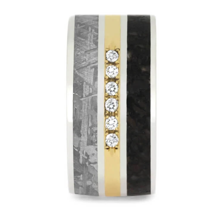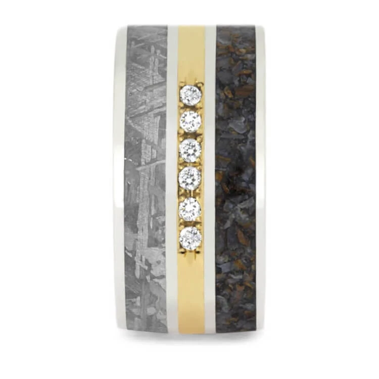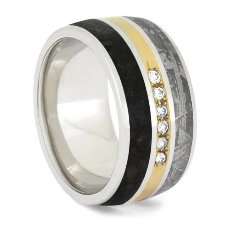 The man of your life deserves the best, so why not get him a diamond wedding band to match your diamond ring? This platinum ring is inlaid with real Gibeon meteorite and fossilized dinosaur bone on each side. A 14k yellow gold strip lines the center that is set with six dazzling round cut diamonds. All of my men’s meteorite rings are handmade and come with only the finest materials.