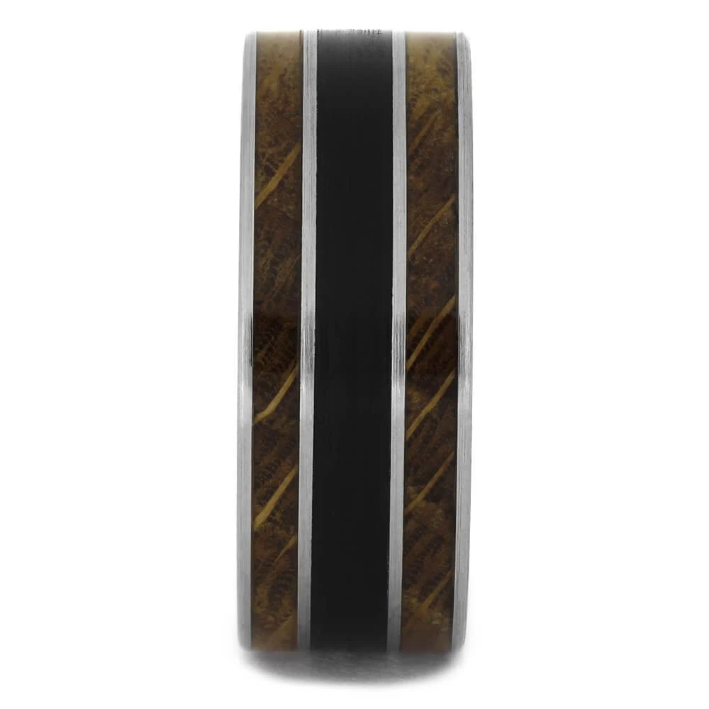This masculine wedding band is great for a musician, featuring an inlay of a vinyl LP record. Two inlays of genuine whiskey barrel wood are framed in brushed titanium, bringing dark natural colors to this men’s wedding band.