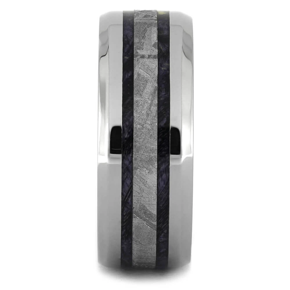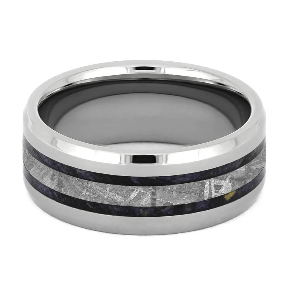 This titanium wedding band can bring some color to your style with purple box elder burl wood. This wood wedding band also has the unique patterns of Gibeon meteorite between the sections of purple wood.