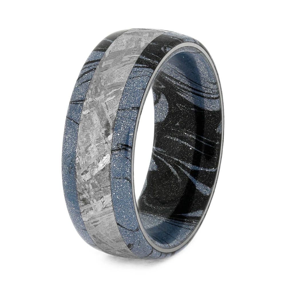 Genuine Gibeon meteorite decorates the inlay of this handmade mixed-metal ring. Blue and back Cobaltium mokume gane surrounds the sleeve and edges of this space wedding band for an out-of-this-world look.