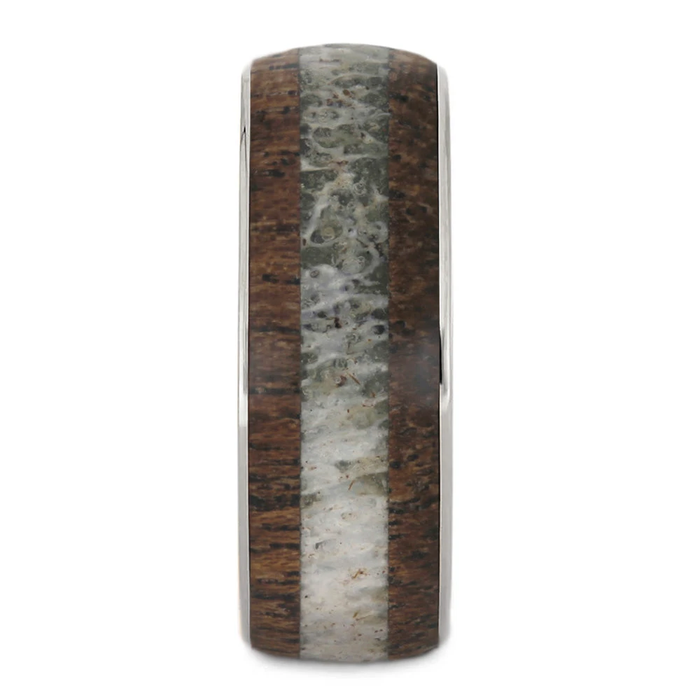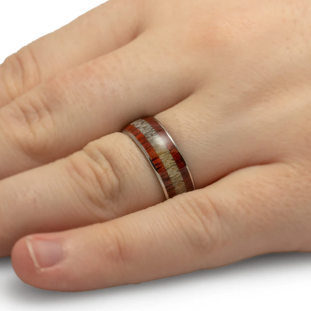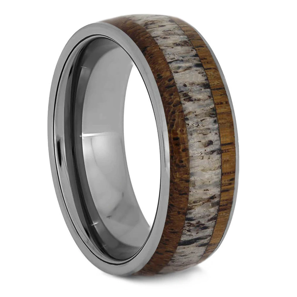Masculine mesquite wood and deer antler combine on this titanium ring for a unique, outdoors-inspired style. You can send in your own deer antler sample for use in your custom ring, or we can provide our own naturally-shed antler for you to choose from. This natural wedding band is a great choice for anyone who loves the outdoors!