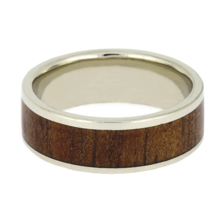Mesquite wood is the special species inlaid in this intriguing 14k white gold ring. Gleaming white gold complements the captivating and natural wood grain patterns, giving this wood ring a beautiful look.