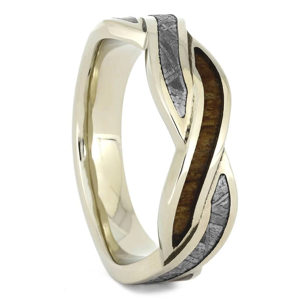 Your lives and hearts are intertwined and this unique, twist style wedding band is a perfect representation of this bond. Authentic Gibeon meteorite and Koa wood are featured in this design, representing earth and space. This nature-inspired ring is crafted in 14k white gold.